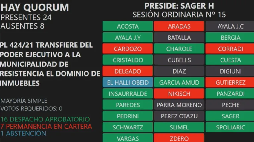 Luego de que las últimas 5 sesiones anteriores no puedan llevarse a cabo por falta de Quórum, y se desatara la polémica entre el oficialismo y la oposición. Hasta inclusive generando rispideces hacia las propias líneas internas del bloque justicialista, hoy en horas de la siesta quedó aprobado con 16 votos a favor, 7 en contra y una abstención, la transferencia de inmuebles desde el estado Provincial hacia el Municipio de Resistencia.
