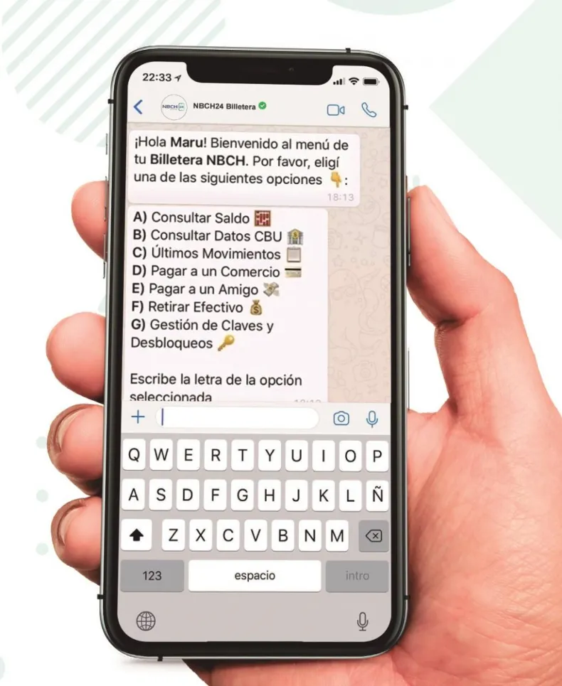 Billetera NBCH24 funciona en WhatsApp. Se activa enviando un mensaje al número verificado 362-515-6224 (NBCH) y luego de realizada el alta, con la validación de identidad y generación de claves para mantener seguras las operaciones, se puede comenzar a operar con sólo enviar un mensaje en WhatsApp.