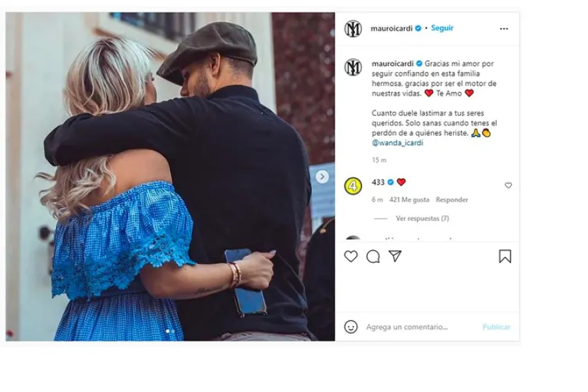 Luego de varias horas de silencio en las redes sociales, Mauro Icardi confirmó su reconciliación con Wanda Nara. El jugador de Paris Saint-Germain, que esta tarde no se presentó al partido que disputó su equipo contra el Leipzig alegando "problemas personales", subió un posteo en su cuenta de Instagram en el que se lo ve abrazado a la madre de sus hijas, Isabella y Francesca, y en el que le dedica unas tiernas palabras agradeciéndole por haber aceptado sus disculpas luego del affaire virtual que mantuvo con Eugenia La China Suárez.