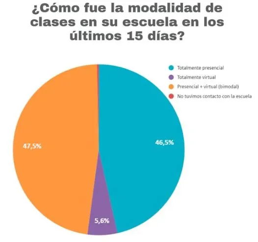 Ante la consulta por la modalidad de clases en los últimos 15 días, las respuestas de las familias entre fines de agosto y mediados de septiembre arrojaron una disparidad marcada. En concreto, un 46,5% de las escuelas tuvieron una modalidad enteramente presencial durante el período relevado, mientras que 47,5% de los colegios continuaron con una modalidad combinada y un 5,6%, totalmente virtual.