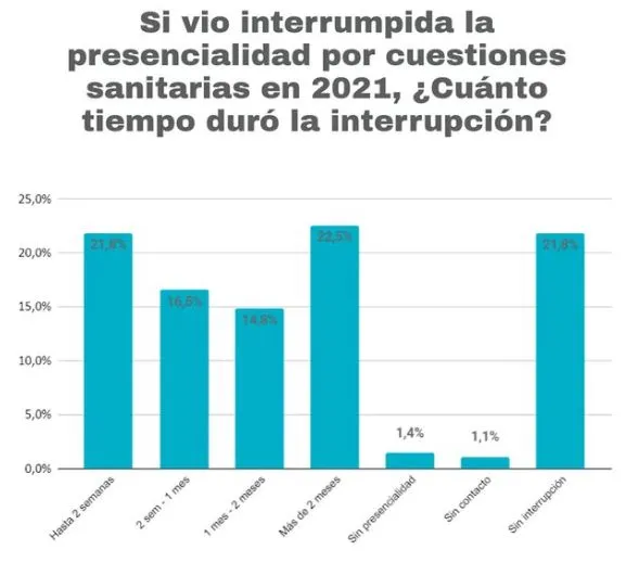 La segunda ola de COVID-19 llevó a que también se decretaran cierres totales que, en algunos casos se extendió por más de dos meses. La mayoría de las escuelas (75,7%) debió suspender la presencialidad en 2021. Entre ellas, 2 de cada 10 debieron cerrar sus puertas por un bimestre o más debido a las restricciones.
