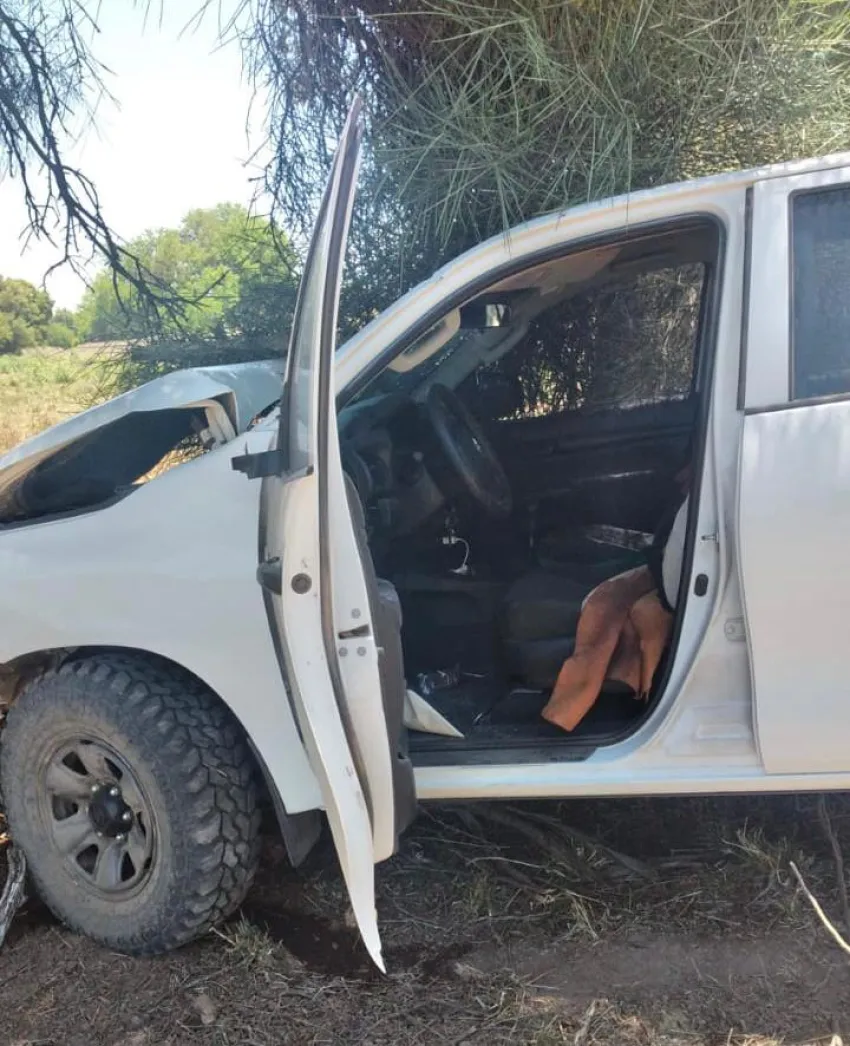 Una vez en el campo la camioneta choca contra un árbol y sus conductores de dan a la fuga hacia una zona de monte.