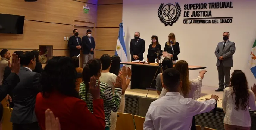 En un acto desarrollado en el Superior Tribunal de Justicia prestaron juramento 49 nuevos abogados y abogadas. La ceremonia fue encabezada por la presidenta subrogante Emilia María Valle, la jueza Iride Isabel María Grillo, el juez Víctor Del Río y el procurador general Jorge Canteros. Y de manera virtual por la defensora general Alicia Alcalá.