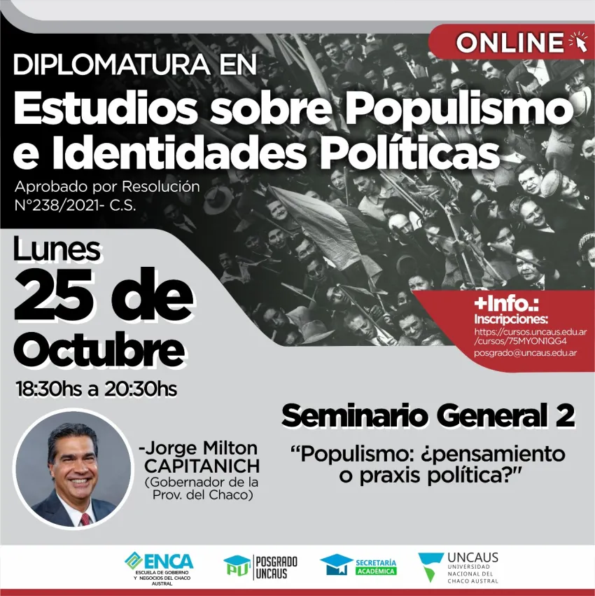 Se realizará en el marco de la Diplomatura en Estudios sobre Populismo e Identidades Políticas, que dicta la Institución junto a la Escuela de Gobierno y Negocios del Chaco Austral (ENCA). La Diplomatura se encuentra aprobada por Resolución N° 238/2021- C.S. de la Universidad.