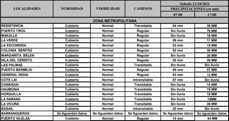 Por otra parte, Puerto Vilelas tuvo 44 milímetros, Margarita Belén tuvo 35 milímetros, Colonia Benítez 30 milímetros y la Isla del Cerrito 26 milímetros. Aún se aguardan datos de Barranqueras.