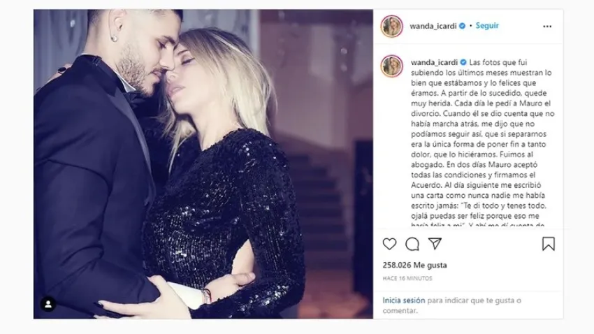 Pese a las especulaciones en relación a su divorcio o a una posible reconciliación, Wanda decidió cortar de raíz con los rumores y fue ella misma quien reveló cómo se encuentra la situación actual con el jugador del PSG. En una carta abierta que compartió en Instagram, la rubia no dejó margen a dudas: "Las fotos que fui subiendo los últimos meses muestran lo bien que estábamos y lo felices que éramos. A partir de lo sucedido quedé muy herida. Cada día le pedí a Mauro el divorcio".