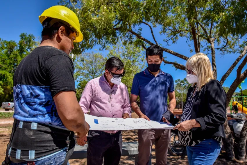 La intendente de Fontana, Patricia Rodas, recorrió las obras que se ejecutan en la plaza Tamborcito de Tacuarí donde se construirán sanitarios masculinos, femeninos y para personas con discapacidad, conectados a la red cloacal.