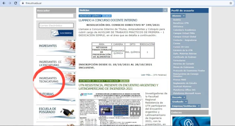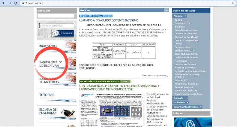 Paso 1: Deberán acceder al sitio frre.utn.edu.ar/académica/inscripción y hacer click en la sección "Ingresantes"