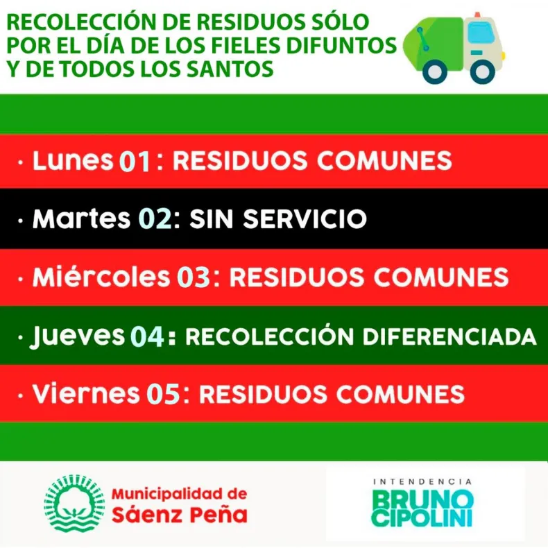 Desde la secretaría de Servicios Públicos Municipal, y a fin de que los ciudadanos sáenzpeñenses puedan conocer exactamente sobre la recolección de residuos en la semana del feriado del 2 de noviembre por el Día de Todos los Santos y de los Fieles Difuntos, informaron cómo se va a desarrollar la actividad: