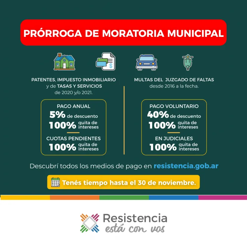 El Municipio de Resistencia prorrogó hasta el martes 30 de noviembre el régimen especial de facilidades de pago para regularizar deudas municipales y multas, correspondientes a los períodos 2020 y 2021.