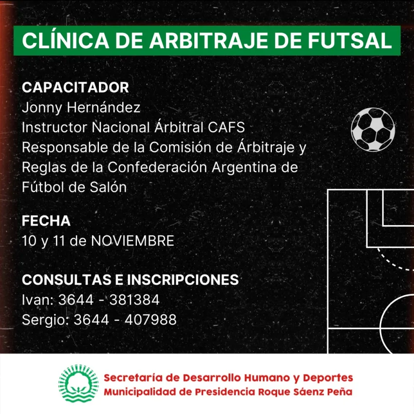 Este 10 y 11 de noviembre, se brindará una Clínica de Arbitraje de Fustal, a través de un curso con clases teóricas que se dictarán en el Centro Cultural Municipal, y prácticas que se realizarán en el Polideportivo Municipal.