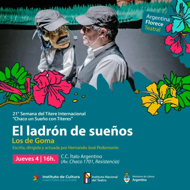 A las 16 actúa el grupo "Los de Goma" con la obra infantil "El ladrón de sueños" en el Centro Cultural Ítalo Argentino (Av. Chaco 1650, Resistencia). La obra cuenta la historia de don Pepe, un anciano que pasa sus días cultivando plantas, y vive junto a su mejor amigo, el perro Tribilin. Un día Pepe escucha una terrible noticia, este hecho pondrá en peligro la casa y su amistad.