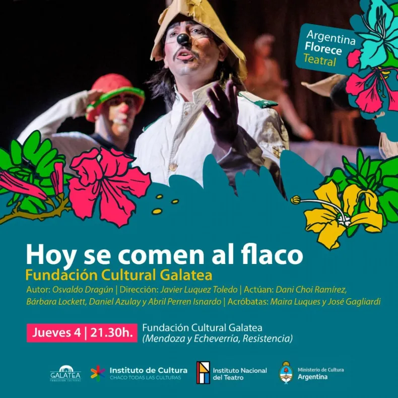 Culminando el jueves, a las 21.30 se presenta la compañía teatral de "Galatea", con "Hoy se comen al flaco", la función será en la sede de la Fundación Cultural Galatea (Mendoza y Echeverría, Resistencia), con acceso libre para estudiantes de la Facultad de Artes Diseño y Ciencias de la Cultura, de la UNNE y el ISPEA Danza y Teatro. Para el público general, con reserva tendrá un valor de $300, y en puerta $400.