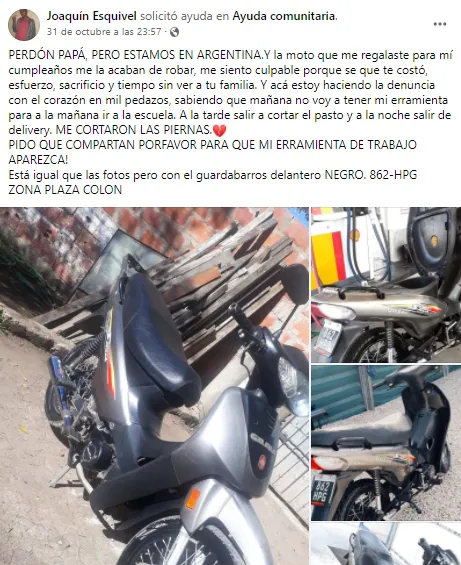 En su afán de dar detalles a su padre continúa describiendo: "Acá estoy haciendo la denuncia con el corazón en mil pedazos, sabiendo que mañana no voy a tener mi herramienta para a la mañana ir a la escuela; a la tarde salir a cortar el pasto y a la noche salir de delivery. Me cortaron las piernas", sentenció el joven en sus redes sociales y ahora, pide ayuda para recuperarla.
