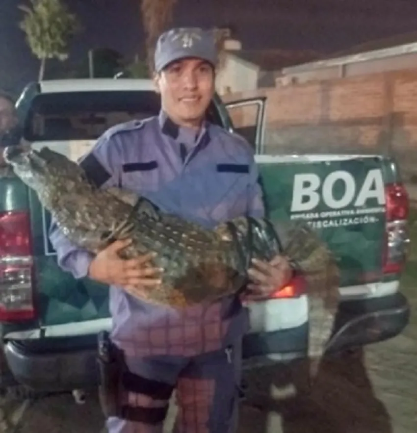 Todo comenzó a las 2:30 horas, momento en el que uniformados realizaban tareas de prevención por el pasaje Farias al 900 aproximadamente, cuando una ciudadana los informó de que en el patio de su domicilio había ingresado un caimánido endémico, conocido como yacaré.