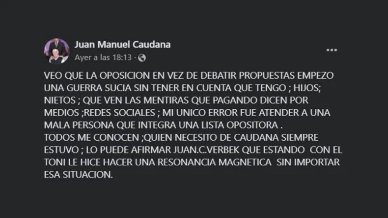 Lejos de retractarse tras la viralización en redes sociales de los mensajes, Caudana publicó un mensaje en su perfil de Facebook en el que ratificó sus polémicas afirmaciones y hasta se dio el lujo de chicanear a la oposición.