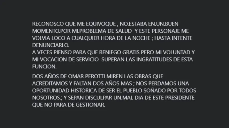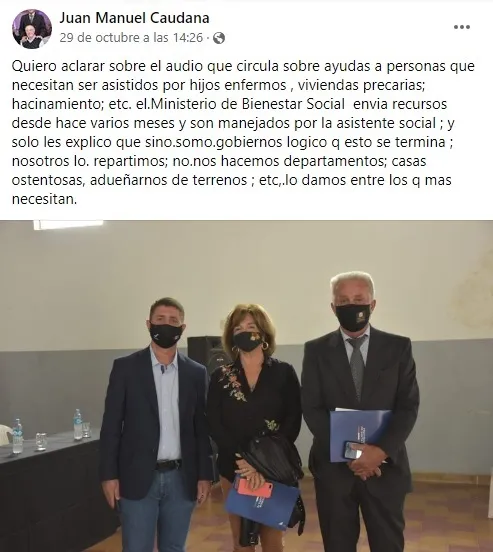 "Quiero aclarar sobre el audio que circula sobre ayudas a personas que necesitan ser asistidos por hijos enfermos, viviendas precarias; hacinamiento; etc. El Ministerio de Bienestar Social envía recursos desde hace varios meses y son manejados por la asistente social; y solo les explico que si no somos Gobierno lógico que esto se termina; nosotros lo repartimos; no nos hacemos departamentos; casas ostentosas, adueñarnos de terrenos, etc; lo damos entre los que más necesitan", afirmó el intendente en su cuenta de la mencionada red social.