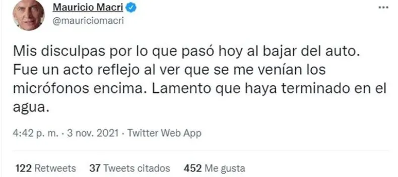 Varias horas después, ante el repudio de los dirigentes y asociaciones periodísticas, Macri expresó en su cuenta de Twitter: "Mis disculpas por lo que pasó hoy al bajar del auto. Fue un acto reflejo al ver que se me venían los micrófonos encima. Lamento que haya terminado en el agua".