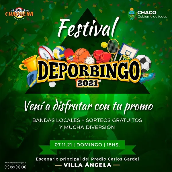 El Directorio de Lotería Chaqueña invita, este domingo en Villa Ángela, al gran Festival Deporbingo que se realizará en el escenario principal del Predio Carlos Gardel. El festival comenzará a las 18 y habrá shows en vivo de bandas locales, sorteos gratuitos y muchas otras sorpresas.