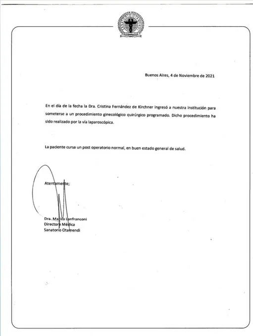 Hace alrededor de un mes, el sábado 2 de octubre por la mañana, la titular de la Cámara alta visitó el Sanatorio Otamendi como parte de un chequeo programado, y entonces completó unos análisis "habituales", informaron sus allegados en aquel momento.