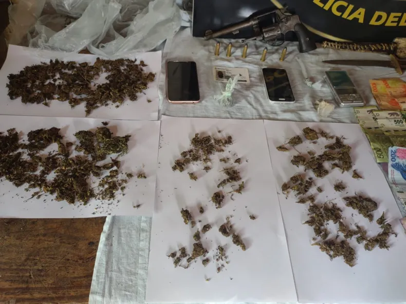 A raíz del allanamiento, los agentes procedieron al secuestro de un frasco que contenía cogollos de marihuana, con un peso total de 23 gramos, una bolsa con 143 gramos de la misma sustancia, una balanza de precisión, dos cuchillos, dinero en efectivo y un arma de fuego calibre 33 con 5 cartuchos.
