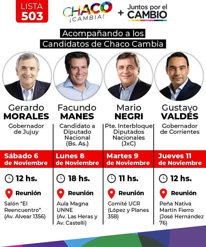 En el marco de la campaña electoral rumbo a las elecciones del próximo 14 de noviembre, el gobernador de Jujuy Gerardo Morales, el candidato a diputado nacional de Juntos por el Cambio por la provincia de Buenos Aires Facundo Manes, el presidente del interbloque de diputados nacionales de Juntos por el Cambio Mario Negri y el gobernador de Corrientes Gustavo Valdés visitan la provincia del Chaco para expresar su acompañamiento a los candidatos de Chaco Cambia, Lista 503 encabezadas por Juan Carlos Polini como candidato a diputado nacional y Leandro Zdero a diputado provincial.