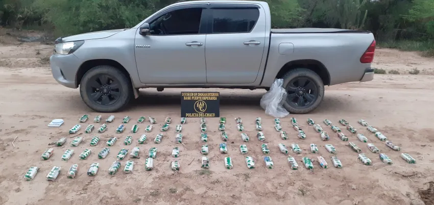 A su vez, pasadas las 19 horas, efectivos pertenecientes a la Div. Operaciones Drogas Interior El Impenetrable, con Base en Fuerte Esperanza, desplegaron un importante operativo de Control y Detección de Sustancias Prohibidas en Ruta N° 13 entre Comandancia Frias y Linea Barilari, en el cual, demoran el paso de una camioneta Toyota Hilux, color gris, con dos ocupantes, siendo el conductor un hombre de 24 años oriundo de Pampa del Indio y el acompañante de 32, domiciliado en Juan José Castelli, a quienes se les detectó que transportaban dos bultos grandes envueltos en nylon negro.