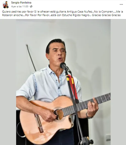 Anteriormente, en otra publicación había añadido: "Quiero pedirles por favor si le ofrecen está guitarra marca Antigua Casa Núñez, no la compren, me la robaron anoche, por favor por favor" sentenció y agregó "Está con un estuche rígido negro, gracias gracias".