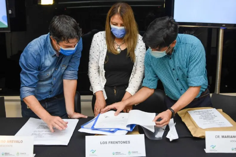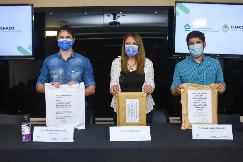 Con un total de tres empresas oferentes, el presidente del Instituto Provincial de Desarrollo Urbano y Vivienda (IPDUV), Diego Arévalo junto a la intendenta Judith Gómez, encabezó la apertura de sobres de licitación de otras 20 viviendas para la localidad de Los Frentones. Se trata de obras que demandarán una inversión de $94.425.701,13 por parte del Estado para su ejecución y están contempladas dentro del plan de reactivación económica.