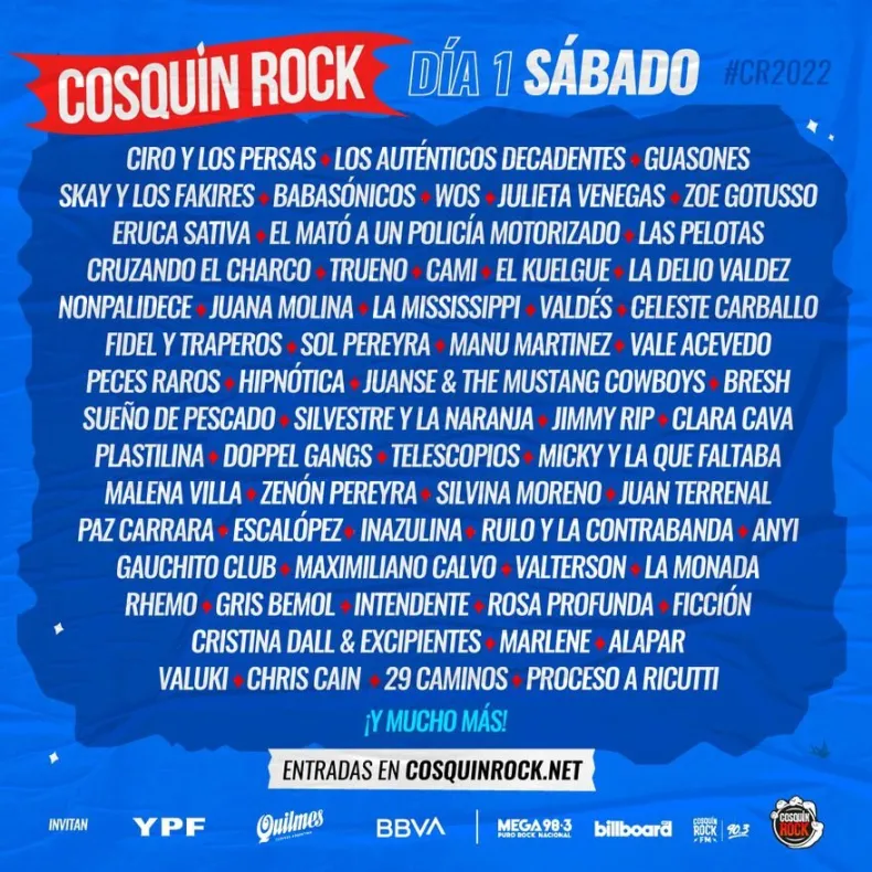 Estarán presentes el sábado 12 artistas y bandas como Ciro y Los Persas; Eruca Sativa; Los Auténticos Decadentes; El Kuelgue; Zoe Gotusso; Trueno; Las Pelotas, entre muchos otros, cuya lista completa se exhibe en el flyer del evento.