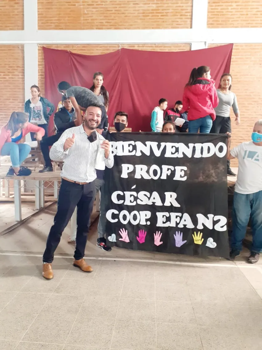 Integrantes de la Cooperadora de la ESFA N° 2 de "El Zanjón" junto a la promoción del colegio organizaron una bienvenida al profesor de Matemática César Solís, después de cinco meses de estar separado de su cargo.