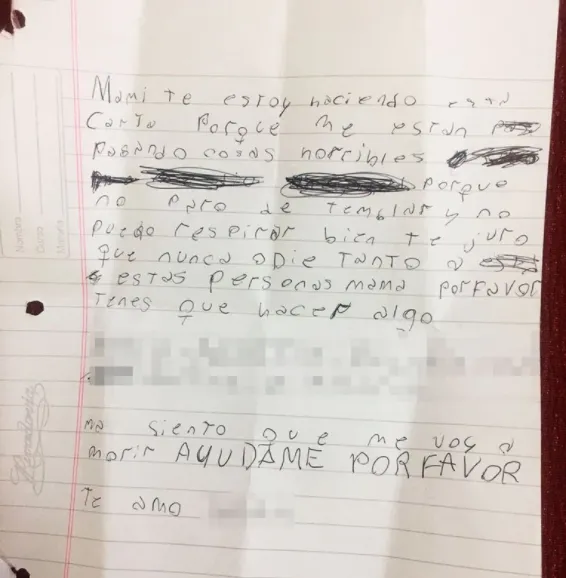 La letra es desprolija, escrita en tinta negra, tiene partes tachadas y solo tres palabras en mayúsculas: "Ayudame por favor". Dice: "Mami, te estoy haciendo esta carta porque me están pasando cosas horribles. No paro de temblar y no puedo respirar. Te juro que nunca odié tanto a estas personas. Mamá, por favor tenés que hacer algo. Ma, siento que me voy a morir". El mensaje cierra con las tres palabras en mayúsculas, un "te amo" y su nombre.