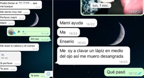 La carta que le dedicó su hija fue bisagra. "Que mi hija me escribiera que no podía seguir viviendo así, me destruyó", contó su madre. Desde entonces, la menor lleva el celular al colegio para mantenerla al tanto de su estado anímico. Bárbara compartió algunos mensajes que su hija le envió el 13 de septiembre y el primero de noviembre: "Podés llamar al abuelo para que me busque. Me siento muy mal, por favor mami" le pidió en septiembre y "Mami ayuda, ma en serio. Me voy a clavar el lápiz en el medio del ojo así me muero desangrada", le advirtió el lunes pasado. Hay otros mensajes más angustiantes que prefirió no compartir.
