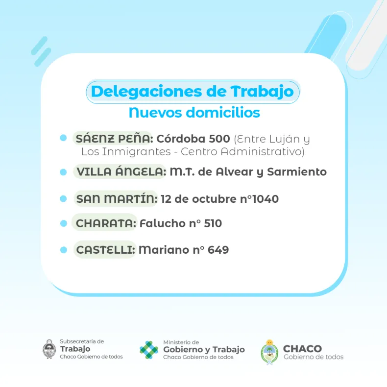 Además, como parte de la descentralización de la cartera para facilitar el acceso a los servicios, la Dirección de Trabajo cuenta con oficinas en Presidencia Roque Sáenz Peña (calle Córdoba entre Luján y Cervantes en el centro cívico de la localidad), en Villa Ángela (Marcelo T Alvear y Sarmiento), en General San Martín (12 de Octubre 1040), en Charata (Falucho 510) y en Castelli (Moreno 649).