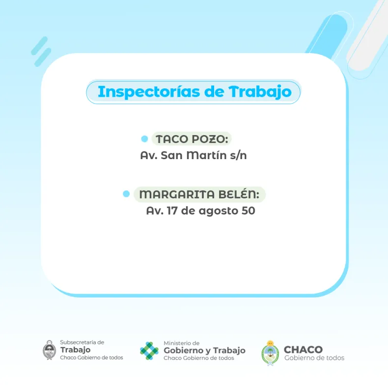 En tato las inspectorías de Trabajo cuentan con oficinas en el Municipio de Taco Pozo y en Margarita Belén (avenida 17 de Agosto 50). A través de las distintas dependencias se trabaja para ofrecer un servicio de calidad a cada chaqueña y chaqueño con oficinas públicas en óptimas condiciones.
