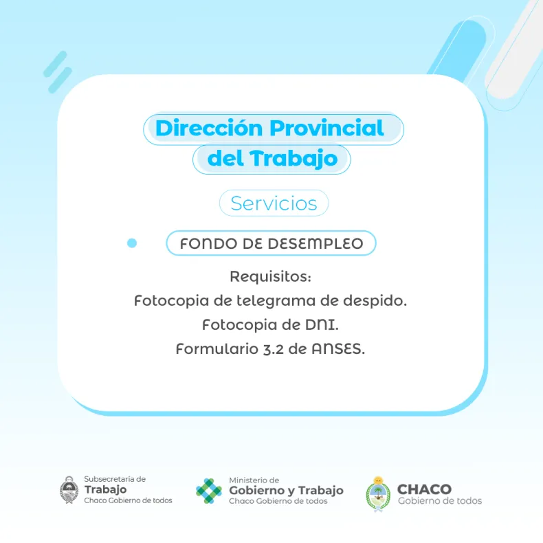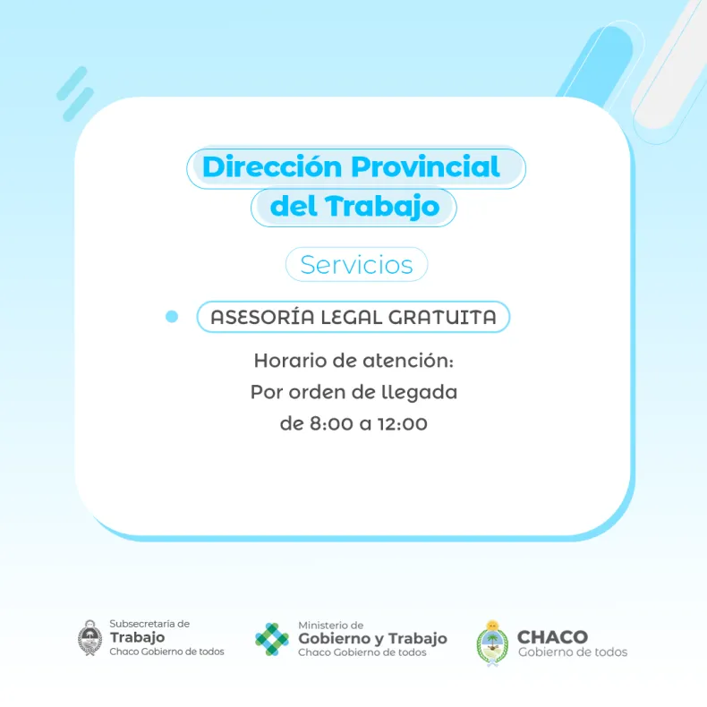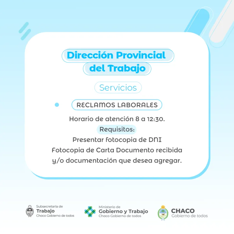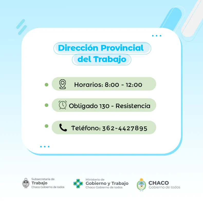 El Ministerio de Gobierno y Trabajo recuerda que la Dirección Provincial de Trabajo (DPT) brinda distintos tipos de asistencia y acompañamiento a trabajadoras y trabajadores, tanto públicos como privados, de toda la provincia. Las oficinas ubicadas en Obligado 130 están disponibles de lunes a viernes, de 8 a 12.30. También pueden comunicarse al número 3624-427895.