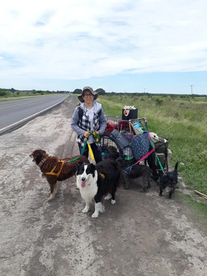 Como no tienen vehículo ni dinero para costear pasajes de algún transporte, decidieron iniciar el trayecto a dedo como mochileros, junto a sus 4 perros y 2 gatas.