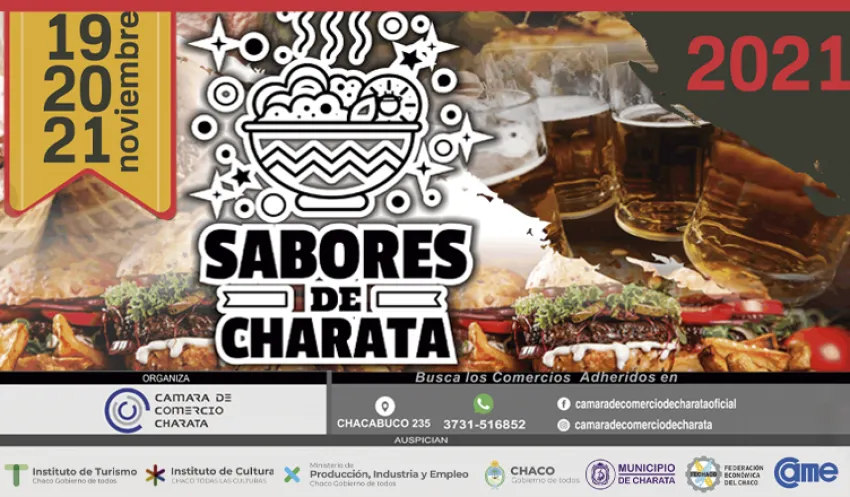La Cámara de Comercio de Charata, a través de su comisión directiva, invita a los chaqueños y charatenses a sumarse a disfrutar de "Sabores de Charata", un corredor gastronómico y cultural que tendrá lugar los próximos 19, 20 y 21 de noviembre, en dicha localidad.