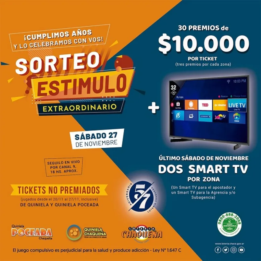 El Directorio de Lotería Chaqueña lanzó el Sorteo Estímulo Extraordinario de tickets no premiados de Quiniela y Poceada, que se llevará a cabo el 27 de noviembre como parte de las celebraciones por el 57º aniversario, con 20 Smart TV de 32 pulgadas, como premios adicionales. "Es una forma de agradecer al público por su acompañamiento de siempre, principalmente en estos años duros de pandemia que nos tocó atravesar", señaló el presidente Gabriel Lemos.