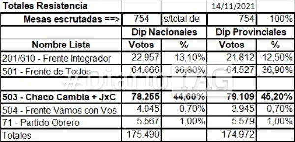 Diario TAG pudo acceder a la planilla que refleja la decisión de los resistencianos en las 754 mesas habilitadas en la ciudad. De un total de 175.490 votos en la categoría diputados nacionales, Chaco Cambia logró 78.255 (44,60%), Frente de Todos 64.666 (36,80%), Frente Integrador 22.957 (13,10%), Partido Obrero 5.567 (1%) y Vamos Con Vos 4.045 (0,70%).