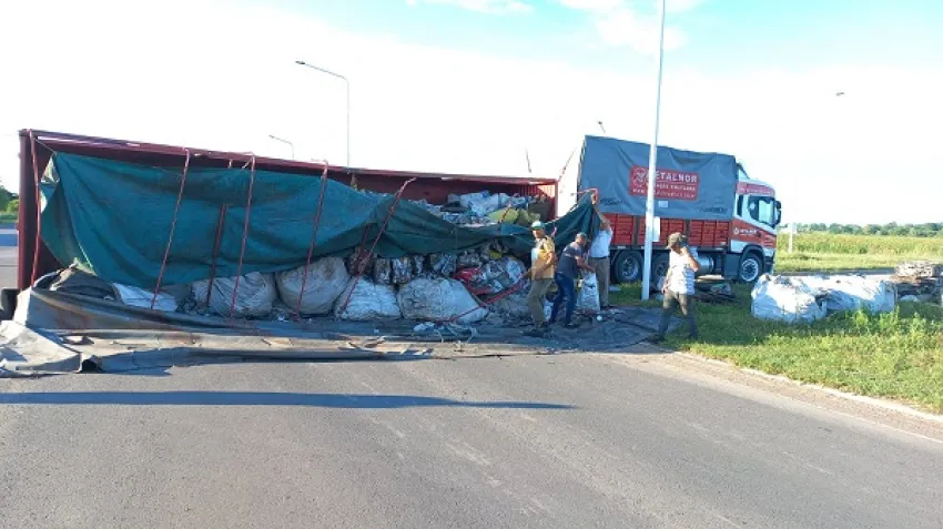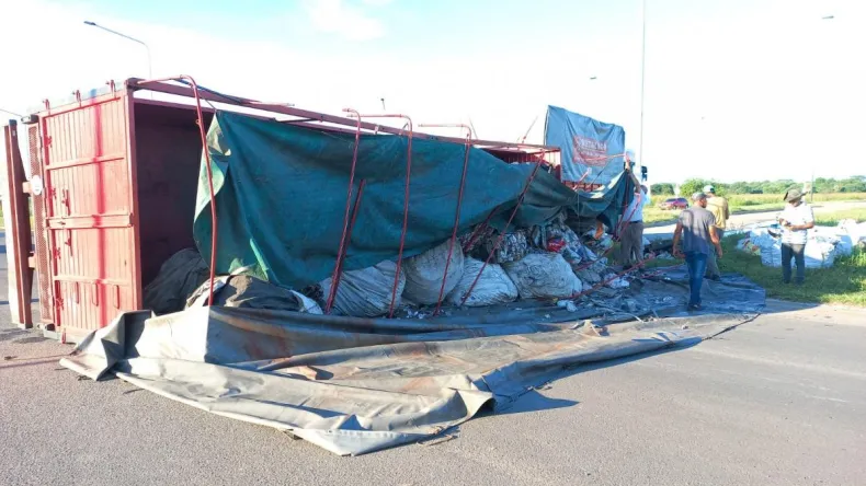 El vuelvo del acoplado provocó que la chatarra que transportaba se disperse por toda la ruta.
