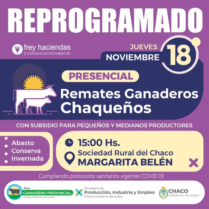 El Ministerio de Producción, Industria y Empleo informó este martes que el remate ganadero para pequeños y medianos productores de Margarita Belén se realizará finalmente el jueves 18, a partir de las 15. Saldrán a pista animales con destino a conserva, abasto e invernada aportados por pequeños y medianos productores locales y de parajes vecinos.