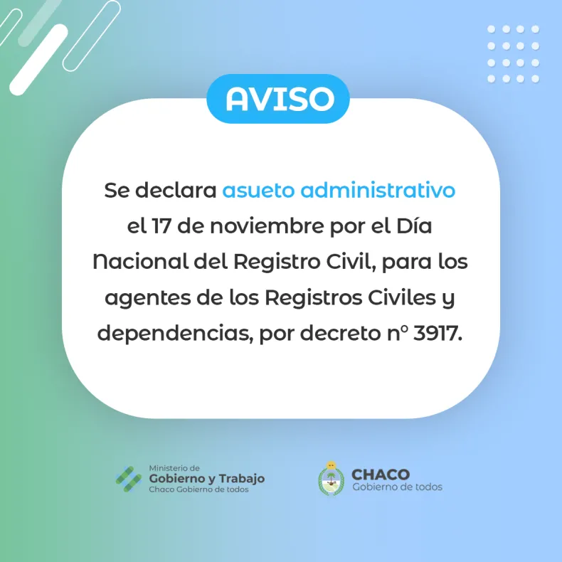 El Ministerio de Gobierno y Trabajo informa que, a través del decreto 3917, el miércoles 17 de noviembre será asueto administrativo para agentes de la Dirección General de Registro Civil, en todas las dependencias de la provincia, al conmemorarse el "Día Nacional del Registro Civil". Por esta razón no habrá servicio de atención durante la jornada, en tanto las actividades se retomarán el jueves en sus horarios habituales.