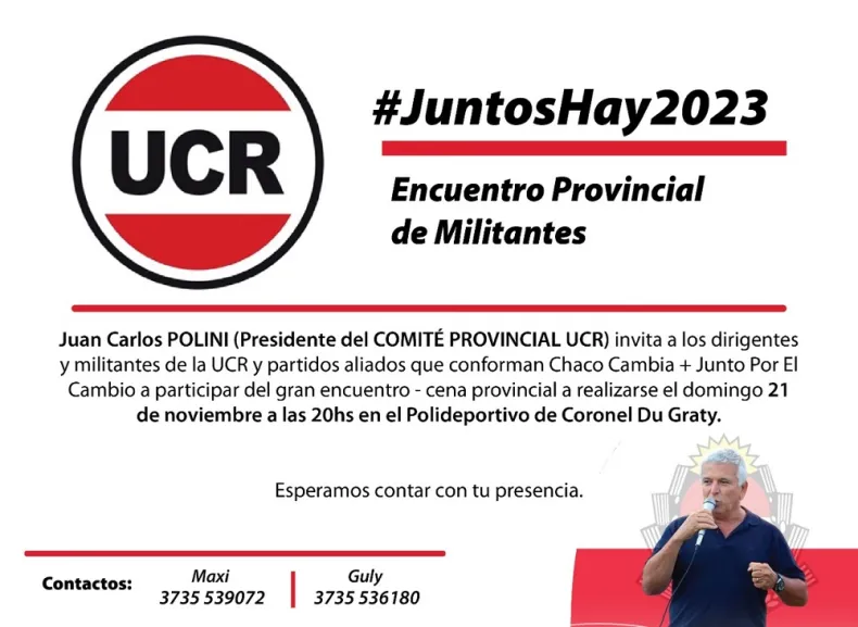 Bajo el lema #JuntosHay2023, el presidente del Comité Provincial de la UCR, Juan Carlos Polini, convoca a dirigentes, legisladores provinciales y nacionales, intendentes y concejales a participar del Encuentro Provincial de Militantes a realizarse el domingo 21 de noviembre a la hora 20:00 en el polideportivo de la localidad de Coronel Du Graty. Cabe mencionar que también han sido invitados referentes de los partidos que integran la alianza Chaco Cambia (PRO, Coalición Cívica-ARI, Bases y Principios y organizaciones sociales).