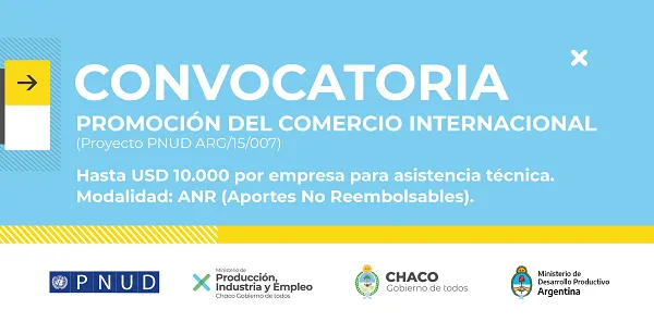El Ministerio de Producción, Industria y Empleo convoca a empresas chaqueñas a sumarse al programa de Promoción del Comercio Internacional, iniciativa impulsada en conjunto por el gobierno nacional y el Programa de las Naciones Unidas para el Desarrollo (PNUD). Este esquema -denominado Proyecto PNUD ARG/15/007- tiene como objetivo incrementar la inserción de las compañías argentinas en el mercado internacional y está dirigido a aquellas firmas con capital nacional, exportadores o con potencial para el comercio exterior.