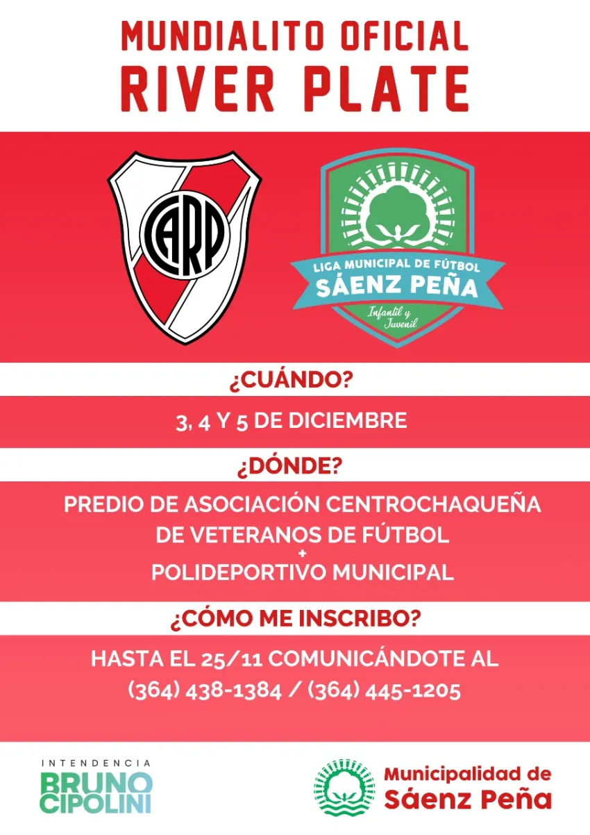 El "Mundialito Oficial de River Plate" tendrá lugar los días 3, 4 y 5 de diciembre en el predio de la Asociación de Fútbol de Veteranos y el Polideportivo Municipal. El evento es organizado conjuntamente entre el Club River Plate y la Municipalidad de Presidencia Roque Sáenz Peña.