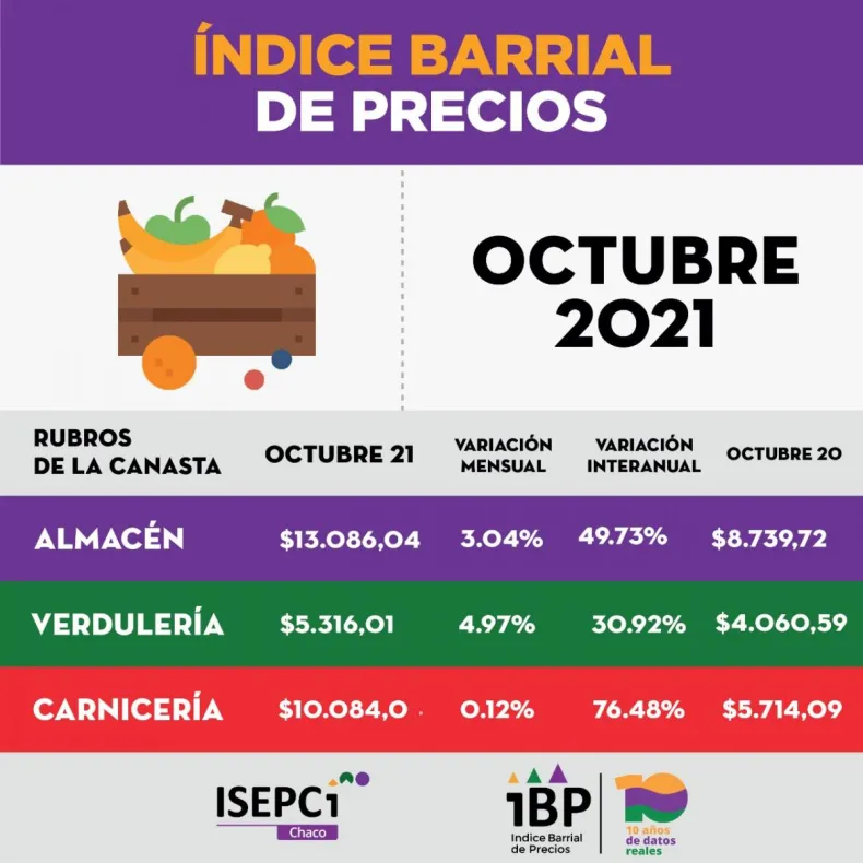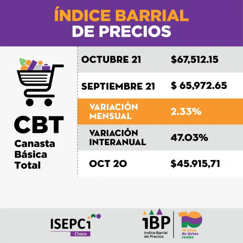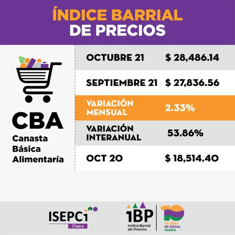 La Canasta Básica Alimentaria y la Canasta Básica Total aumentaron un 2,33 % según el último índice barrial de precios (IBP) realizado por el Instituto de Investigación Social Económica y Política Ciudadana (ISEPCI). La muestra fue tomada en distintos comercios del Gran Resistencia y Sáenz Peña. Su directora, Patricia Lezcano, estableció: "Los precios siguen aumentando y las medidas del gobierno de congelar los precios no llegan a los barrios".