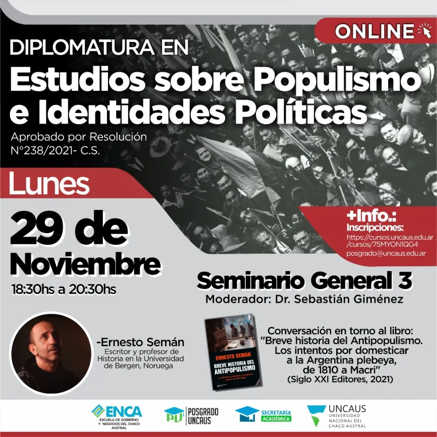 El Seminario se realizará en el marco de la Diplomatura en Estudios sobre Populismo e Identidades Políticas, que dicta la Institución junto a la Escuela de Gobierno y Negocios del Chaco Austral (ENCA). La Diplomatura se encuentra aprobada por Resolución N° 238/2021- C.S. de la Universidad. La misma se realiza con el objetivo principal de fortalecer las capacidades para el análisis de experiencias y discursos políticos populistas y antipopulistas, tanto clásicos como contemporáneos, atendiendo a las complejidades y desafíos que dichas experiencias suponen.