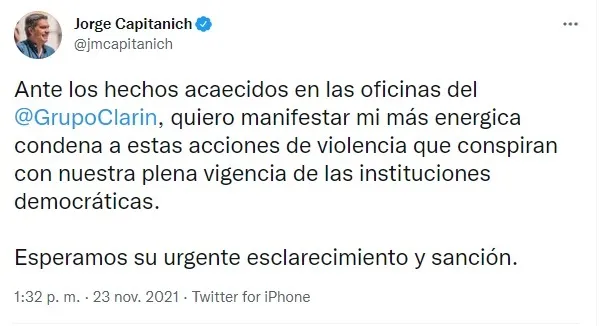 El jefe de estado publicó en sus redes sociales un comunicado: "Ante los hechos acaecidos en las oficinas del @GrupoClarin, quiero manifestar mi más enérgica condena a estas acciones de violencia que conspiran con nuestra plena vigencia de las instituciones democráticas. Esperamos su urgente esclarecimiento y sanción".