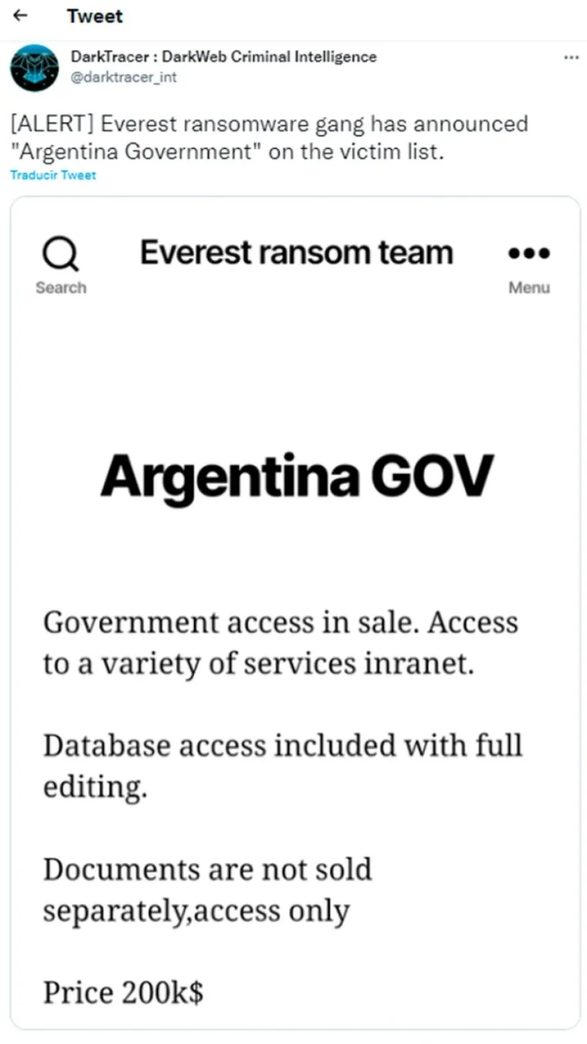 A través de la cuenta de Twitter ‘DarkTracer: Darkweb Criminal Intelligence’, habitualmente especializada en publicar alertas sobre movimientos de hackers en la Deep Web, se anunció que en un foro se puso a la venta una base de datos oficial de la Argentina. El elemento más alarmante del ataque es que los presuntos cibercriminales no sólo ofrecen acceder a datos públicos, sino también editarlos.